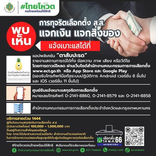 2. ศูนย์รับแจ้งเบาะแสทุจริตการเลือกตั้ง หมายเลขโทรศัพท์ 0 2141 8860, 0 2141 8579 และ 0 2141 8858