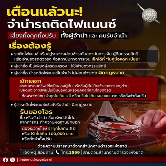 สำนักงานตำรวจแห่งชาติ จึงขอเตือนพี่น้องประชาชนว่า รถที่ติดไฟแนนซ์หรืออยู่ระหว่างผ่อนชำระกับสถาบันทางการเงิน ผู้ถือกรรมสิทธิ์หรือเจ้าของรถตัวจริงของรถคันดังกล่าว คือสถาบันทางการเงิน ส่วนผู้เช่าซื้อเป็นเพียงผู้ครอบครองเท่านั้น ไม่ได้เป็นเจ้าของกรรมสิทธิ์โดยสมบูรณ์