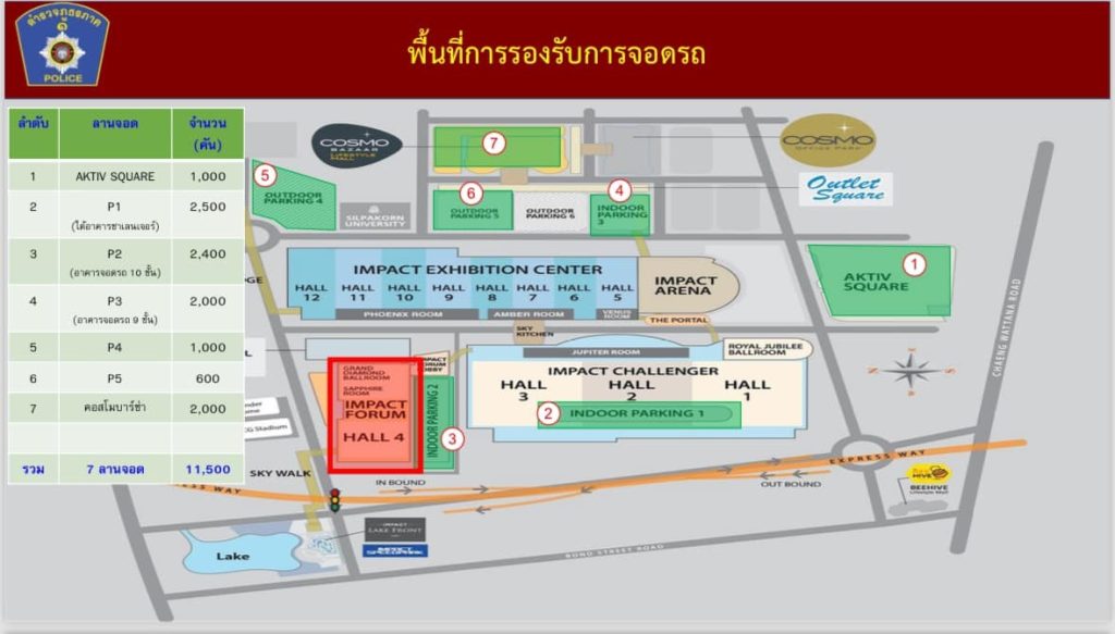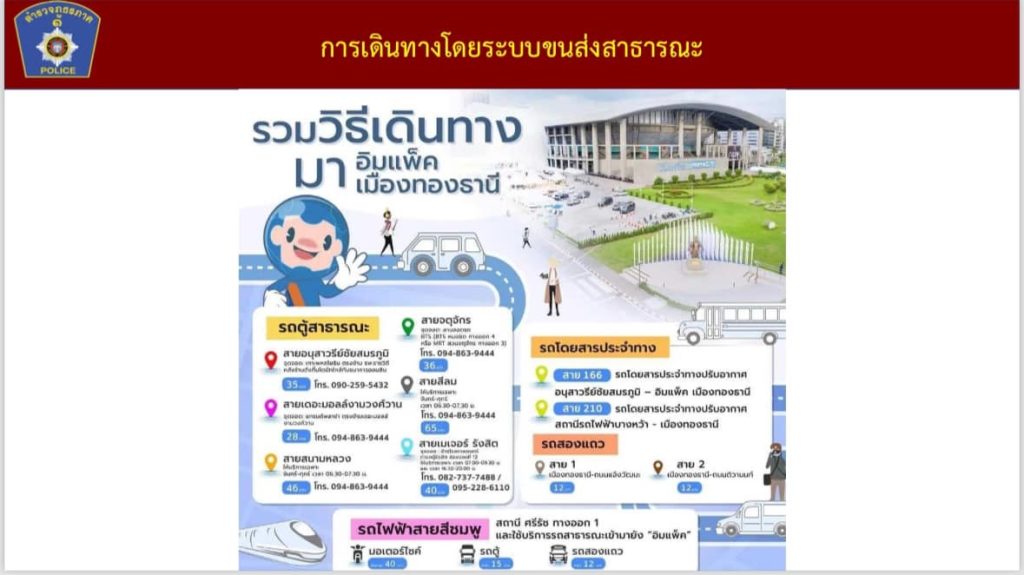 กรณีผู้ที่เดินทางมาลงคะแนนและผู้ที่มาร่วมกิจกรรมนำรถยนต์ส่วนตัวมาเองสามารถจอดยังจุดจอดของเมืองทองธานี จำนวน 7 จุด ซึ่งรองรับได้ประมาณ 10,000 คันเศษ และเพื่อเป็นการลดผลกระทบด้านการจราจรจึงขอความร่วมมือให้ไปใช้ขนส่งสาธารณะจะเป็นการสะดวกกว่า