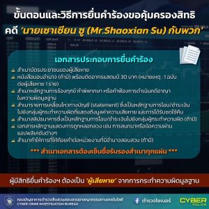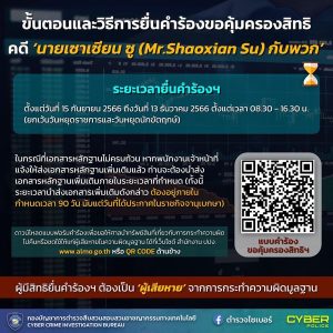 ปปง. เปิดให้ผู้เสีหาย คดี นายเซาเซียน ซู (Mr.Shaoxian Su) กับพวก ยื่นคำร้องขอคุ้มครองสิทธิ ภายใน 90 วัน