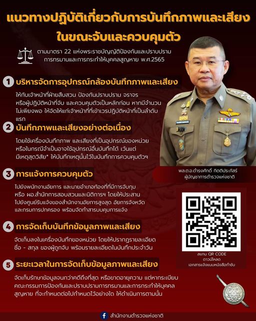 พล.ต.อ.ดำรงศักดิ์ กิตติประภัสร์ ผบ.ตร. กำชับ “แนวทางการปฏิบัติเกี่ยวกับการบันทึกภาพและเสียงในขณะจับและควบคุมตัวตามมาตรา 22 แห่ง พ.ร.บ.ป้องกันและปราบปรามการทรมานและการกระทำให้บุคคลสูญหาย พ.ศ.2565”