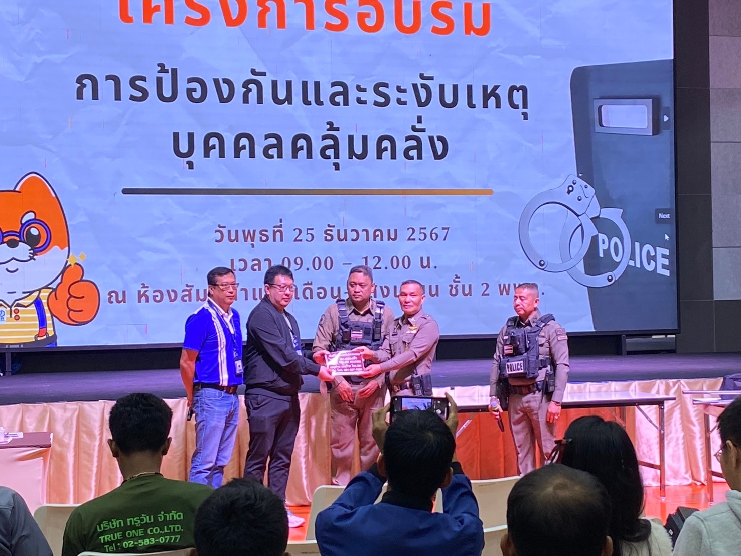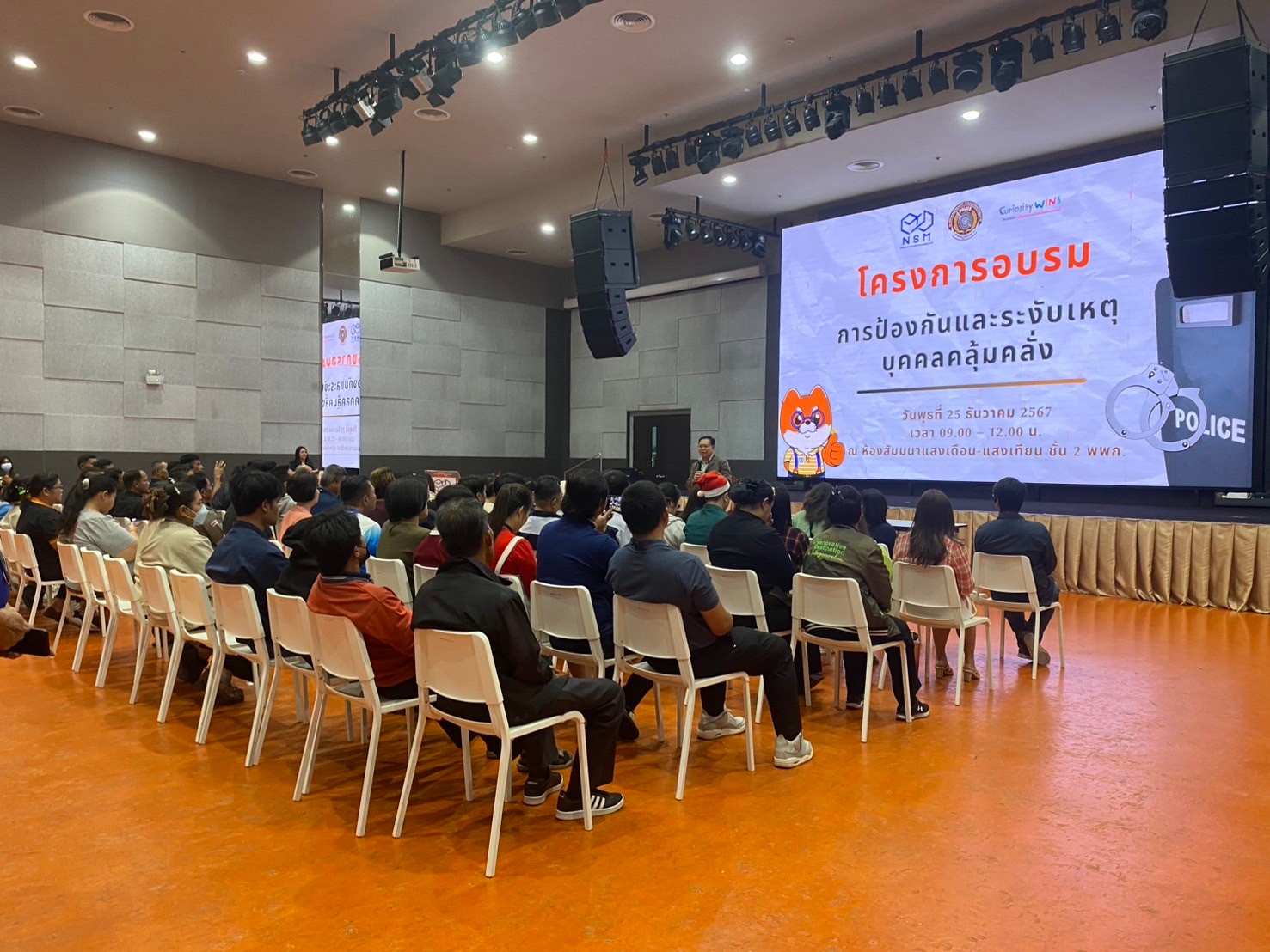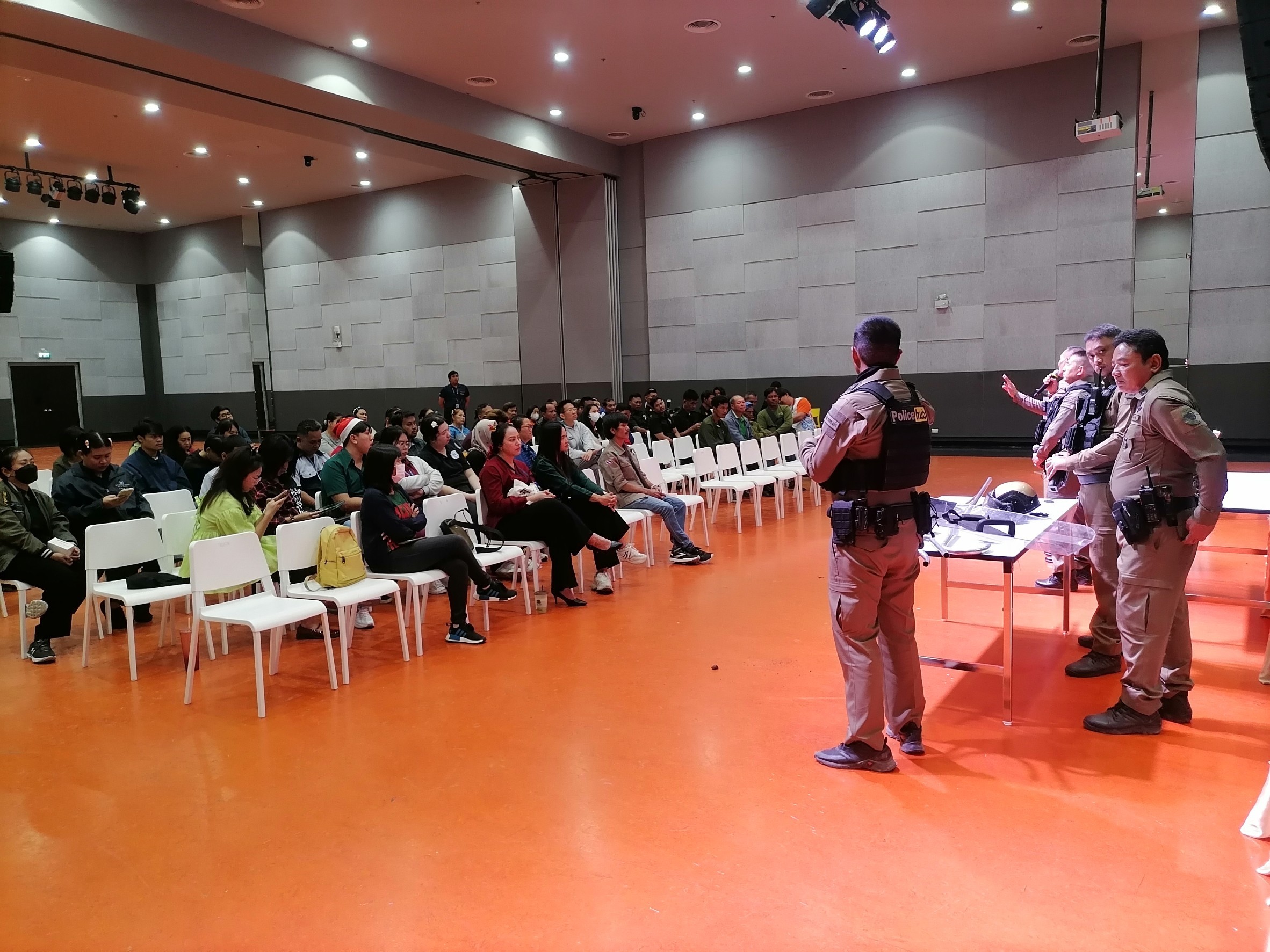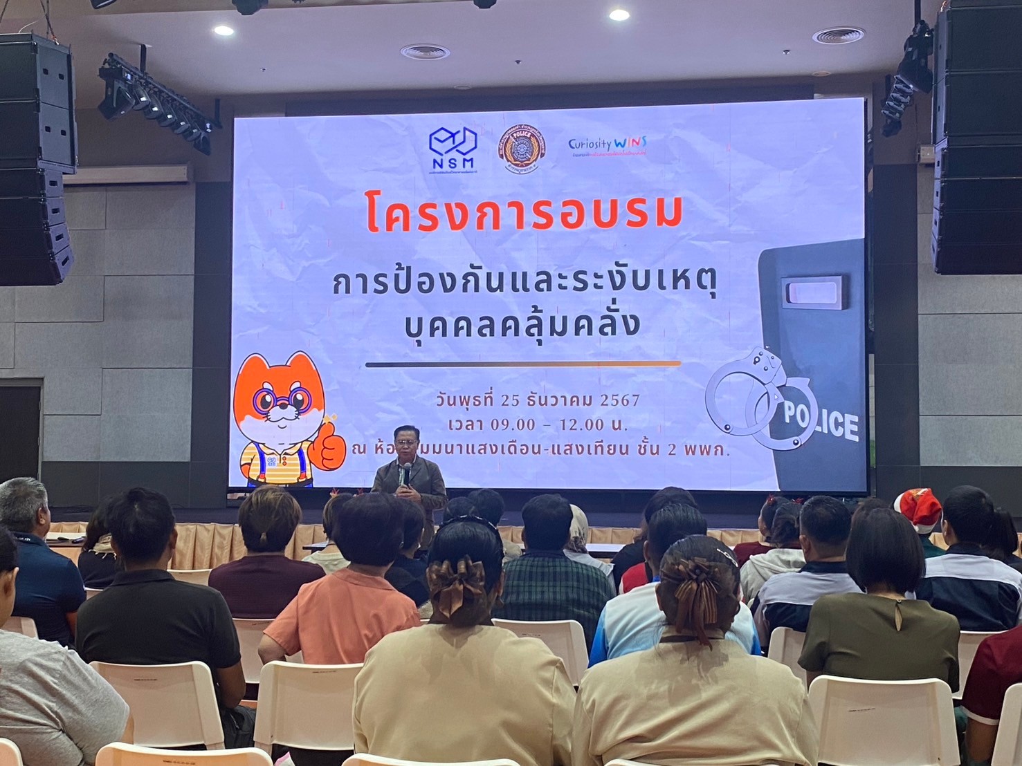 วิทยากรอบรมบรรยายให้ความรู้ การป้องกัน และระงับเหตุ บุคคลคุ้มคลั่ง ให้กับบุคลากรพิพิธภัณฑ์พระรามเก้า (อพวช.) ณ ห้องประชุม ชั้น 2 พิพิธภัณฑ์พระรามเก้า (อพวช.) พร้อมแจกสติกเกอร์ ประชาสัมพันธ์ ช่องทางการแจ้งเหตุด่วนเหตุร้าย และป้องกันรถจักยานยนต์หาย