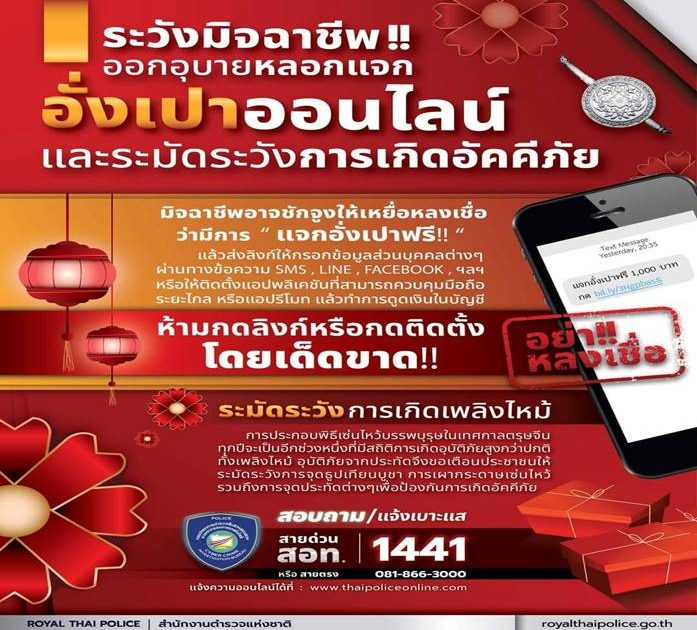 รองโฆษก ตร. ออกโรงเตือนประชาชนระวังมิจฉาชีพออกอุบาย หลอกแจก “อั่งเปาออนไลน์” ย้ำระมัดระวังอัคคีภัยในช่วงเทศกาลตรุษจีน