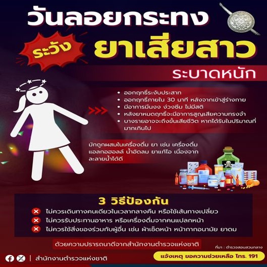 ตำรวจสอบสวนกลาง (CIB) เตือนภัยถึงอันตรายของยาเสียหนุ่ม เสียสาว ที่อาจถูกคนร้ายนำมาใช้ในช่วงเทศกาลลอยกระทง