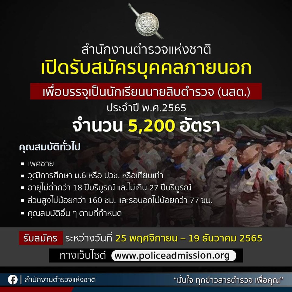 “สำนักงานตำรวจแห่งชาติ” เปิดรับสมัครบุคคลภายนอก เพื่อบรรจุเป็นนักเรียนนายสิบตำรวจ (นสต.) ประจำปี พ.ศ.2565 จำนวน 5,200 อัตรา ประกอบด้วย บช.น. 720 อัตรา, ภ.1 550 อัตรา, ภ.2 370 อัตรา, ภ.3 480 อัตรา, ภ.4 390 อัตรา, ภ.5 440 อัตรา, ภ.6 500 อัตรา, ภ.7 300 อัตรา, ภ.8 200 อัตรา, ภ.9 350 อัตรา, บช.ตชด. 700 อัตรา, บช.ก. 100 อัตรา และ บช.ส. 100 อัตรา