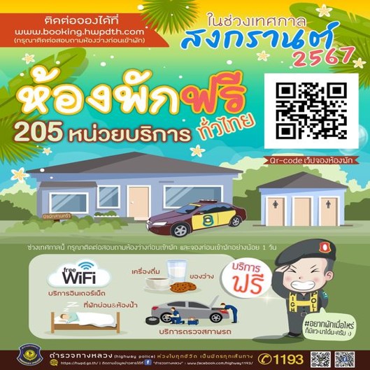 ตำรวจพร้อมบริการ โดยกองบังคับการตำรวจทางหลวง กองบัญชาการตำรวจสอบสวนกลาง เตรียมความพร้อมหน่วยบริการตำรวจทางหลวง 205 หน่วย ที่ตั้งอยู่บนถนนสายหลักทั่วประเทศ ให้ประชาชนสามารถลงทะเบียนเข้าพัก และใช้บริการได้