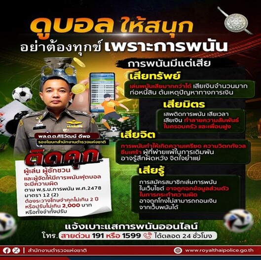 สำนักงานตำรวจแห่งชาติจึงขอให้พี่น้องประชาชนรับชมการแข่งขันฟุตบอลอย่างสร้างสรรค์ อย่าหลงผิดไปเล่นพนันฟุตบอล เพราะผลเสียที่จะตามมานั้นมีมากมาย เช่น