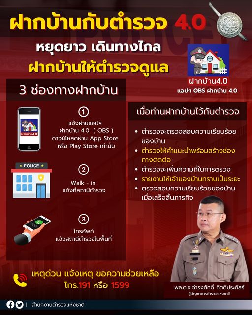 ช่วงวันหยุดต่อเนื่อง หากท่านเดินทางท่องเที่ยว ฝากบ้านกับตำรวจ ใน “ โครงการประชารัฐร่วมใจดูแลความปลอดภัยบ้านประชาชนช่วงเทศกาลสำคัญ ( ฝากบ้าน 4.0 ) ”