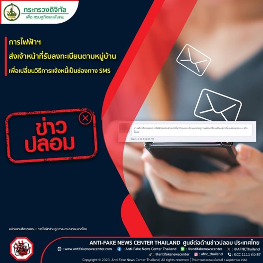 ตามที่มีข้อมูลเผยแพร่เรื่องการไฟฟ้าฯ ส่งเจ้าหน้าที่รับลงทะเบียนตามหมู่บ้าน เพื่อเปลี่ยนวิธีการแจ้งหนี้เป็นช่องทาง SMS