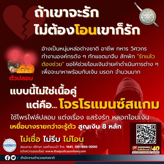 มาแบบนี้ ไม่ใช่เนื้อคู่ แต่คือ “โจรโรแมนซ์สแกม” ที่ใช้โพรไฟล์ปลอม แต่งเรื่อง แสร้งรัก หวังให้เราโอนเงินให้ บางรายกว่าจะรู้ว่าถูกหลอกโอนไปกว่าสิบล้านบาท