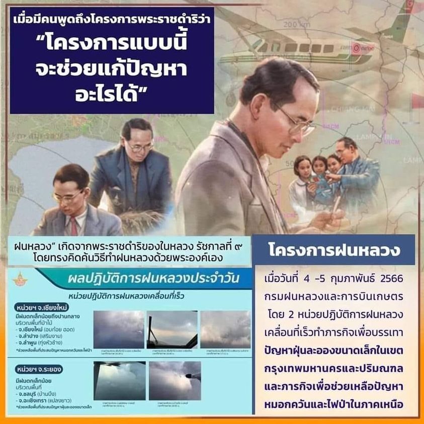 เมื่อวันที่ 4 -5 กุมภาพันธ์ 2566 กรมฝนหลวงและการบินเกษตร โดย 2 หน่วยปฏิบัติการฝนหลวงเคลื่อนที่เร็วทำภารกิจเพื่อบรรเทาปัญหาฝุ่นละอองขนาดเล็กในเขตกรุงเทพมหานครและปริมณฑล และภารกิจเพื่อช่วยเหลือปัญหาหมอกควันและไฟป่าในภาคเหนือ อนึ่ง “ฝนหลวง” เกิดจากพระราชดำริของพระบาทสมเด็จพระบรมชนกาธิเบศร มหาภูมิพลอดุลยเดชมหาราช บรมนาถบพิตร รัชกาลที่ 9 โดยทรงคิดค้นวิธีทำฝนหลวงด้วยพระองค์เอง มี ม.ร.ว.เทพฤทธิ์ เทวกุล ผู้เชี่ยวชาญด้านการเกษตรวิศวกรรมเป็นผู้รับสนองการทดลอง ปฏิบัติการวิจัยและพัฒนาต่าง ๆ