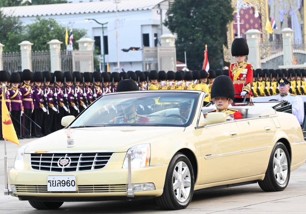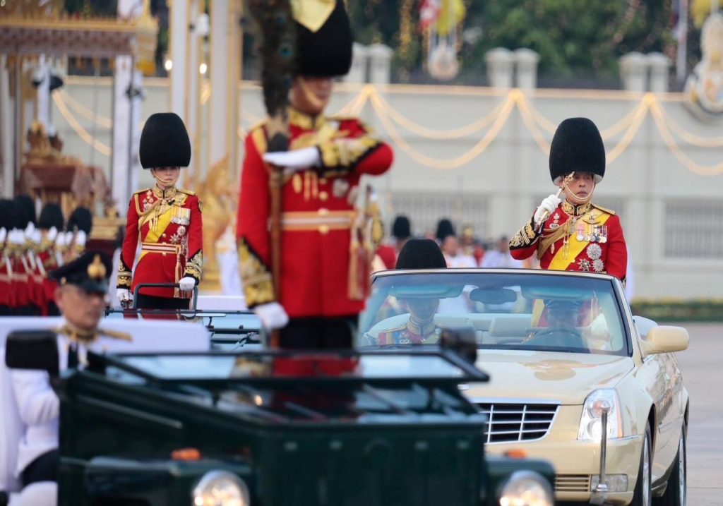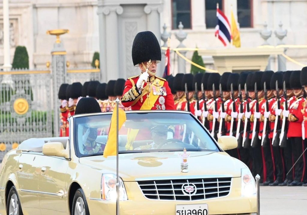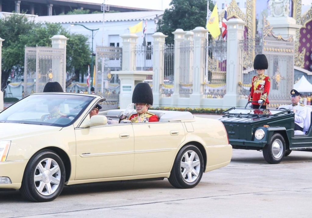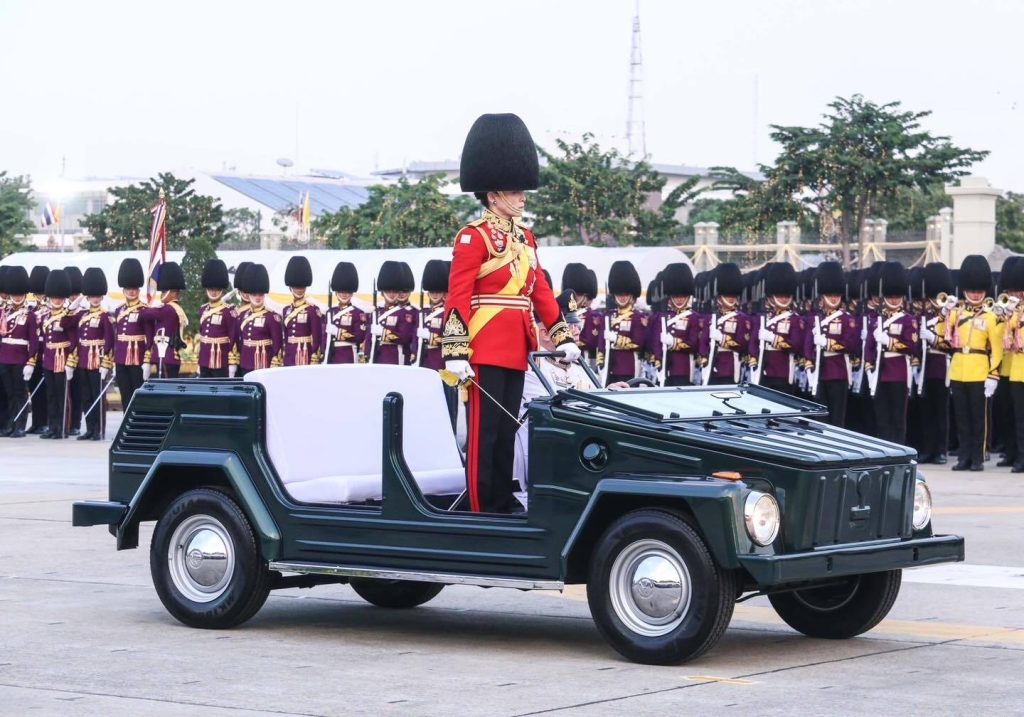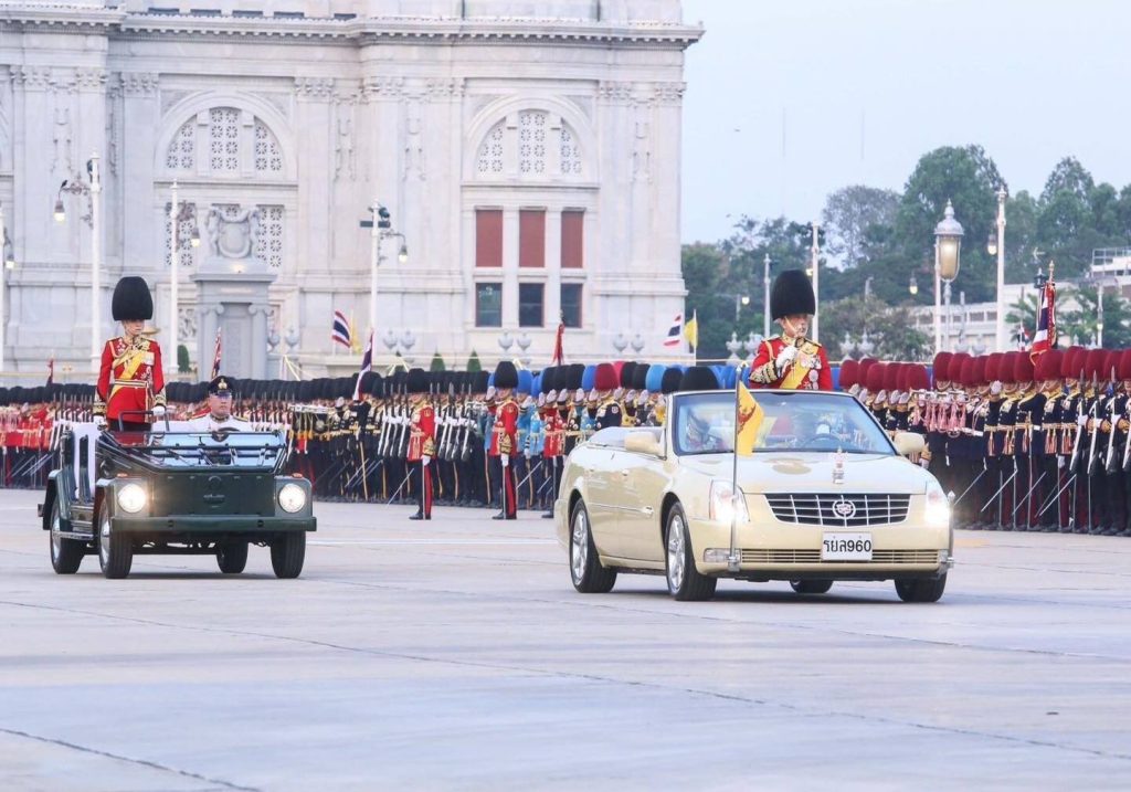 พระบาทสมเด็จพระเจ้าอยู่หัวประทับยืนบนรถยนต์พระที่นั่ง ทรงตรวจพลสวนสนามโดยรถยนต์พระที่นั่งจำนวน 4 กรม 10 กองพัน ซึ่งประกอบด้วย กรมทหารรักษาวังมหาดเล็กราชวัลลภรักษาพระองค์ กองบัญชาการทหารมหาดเล็กราชวัลลภรักษาพระองค์ หน่วยบัญชาการถวายความปลอดภัยรักษาพระองค์, กรมนักเรียนนายร้อยรักษาพระองค์ โรงเรียนนายร้อยพระจุลจอมเกล้า, กรมนักเรียนนายเรือรักษาพระองค์ โรงเรียนนายเรือ, กรมนักเรียนนายเรืออากาศรักษาพระองค์ โรงเรียนนายเรืออากาศนวมินทกษัตริยาธิราช, กองพันทหารราบที่ 1 กรมทหารราบที่ 31 รักษาพระองค์ , กองพันทหารอากาศโยธิน 3 กรมทหารอากาศโยธิน รักษาพระองค์ หน่วยบัญชาการนาวิกโยธิน , กองพันทหารม้าที่ 25 กรมทหารม้าที่ 4 รักษาพระองค์, กองพันทหารราบที่ 2 กรมทหารราบที่21 รักษาพระองค์, กองพันทหารปืนใหญ่ที่ 102 กรมทหารปืนใหญ่ที่ 2 รักษาพระองค์, กองพันทหารราบที่ 1 รักษาพระองค์ กรมทหารราบที่ 1 และกองพลนาวิกโยธิน หน่วยบัญชาการนาวิกโยธิน