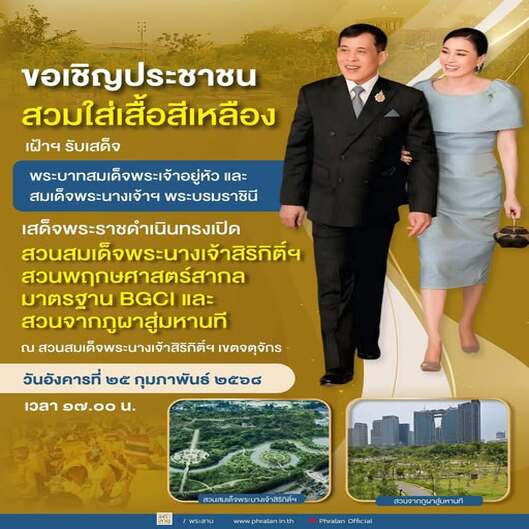 ขอเชิญประชาชนสวมใส่เสื้อสีเหลือง เฝ้าฯ รับเสด็จพระบาทสมเด็จพระเจ้าอยู่หัวและสมเด็จพระนางเจ้าฯ พระบรม
