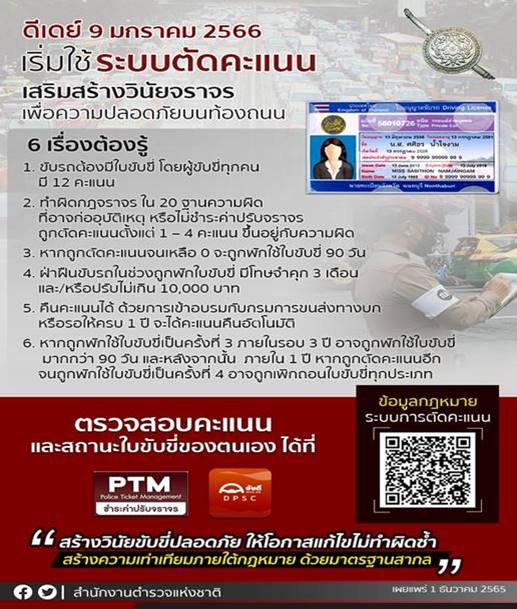 ต้องรู้ !! ดีเดย์ 9 มกราคม 2566 เริ่มใช้ระบบตัดคะแนนความประพฤติในการขับรถ