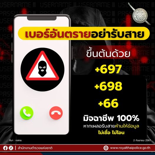 อย่ารับสาย เบอร์อันตราย!! กลับมาระบาดอีกแล้ว เบอร์โทรศัพท์ ขึ้นต้นด้วย +697 +698 หรือ +66 หากมีเบอร์