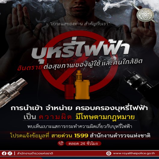 “บุหรี่ไฟฟ้า” อันตรายต่อสุขภาพผู้ใช้ และคนใกล้ชิด แจ้งเบาะแสได้ที่โทร. 1599 . สำนักงานตำรวจแห่งชาติ