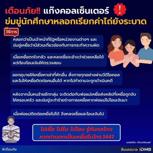 เตือนภัย!! แก๊งคอลเซ็นเตอร์ ข่มขู่นักศึกษาหลอกเรียกค่าไถ่ . – หลอกว่าเป็นเจ้าหน้าที่รัฐหรือหน่